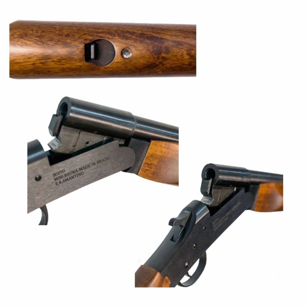 A espingarda de um cano marca BOITO, modelo REÚNA, fabricada na versão Caça, reúne as características de robustez, modernidade e simples manejo já tradicionais em nossa marca. Todas as espingardas modelo REÚNA com cão externo, possuem sistema de fecho autocompensante e trava de segurança no gatilho.